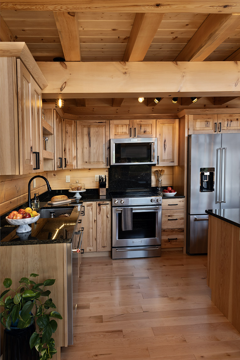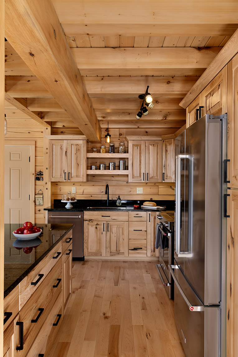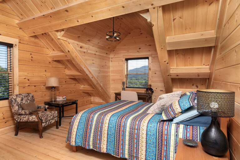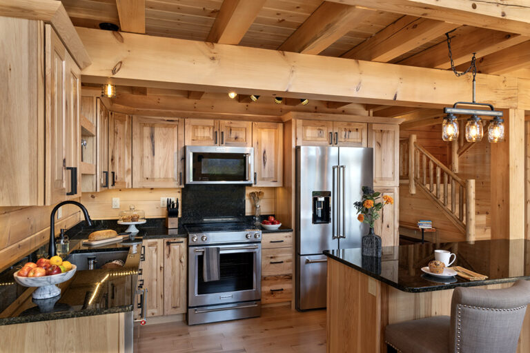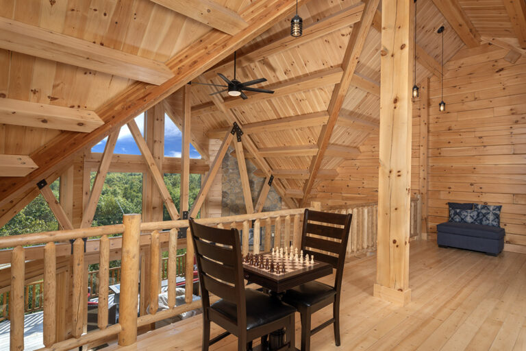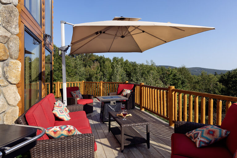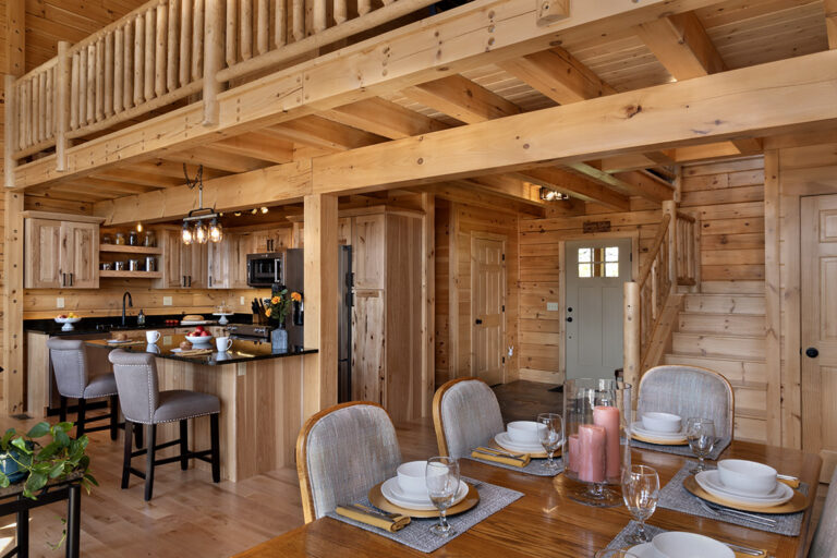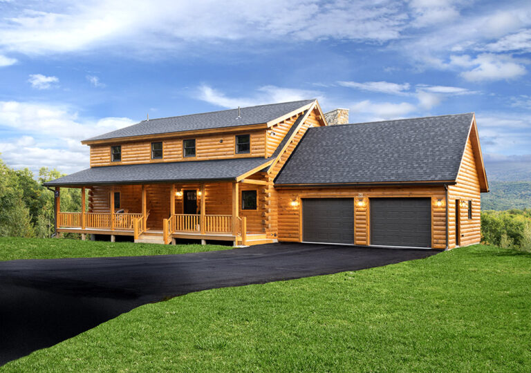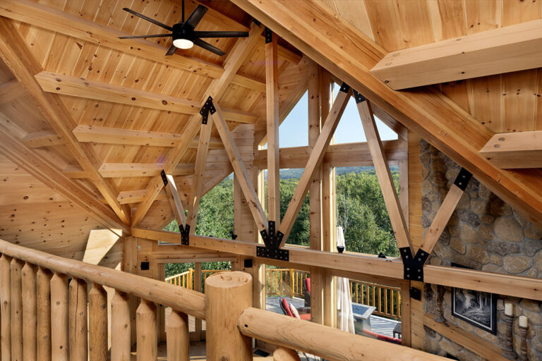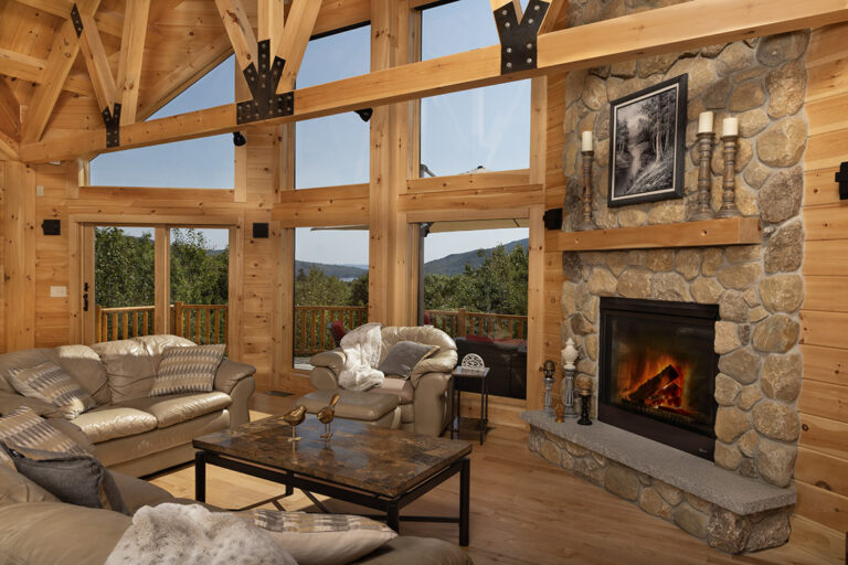 A spacious custom Kearsarge log home featuring a cathedral ceiling, an open-concept living area with fireplace, a main-floor master suite, expansive covered porch and deck, and lofted bedrooms — blending rustic craftsmanship with modern comfort and panoramic natural light.