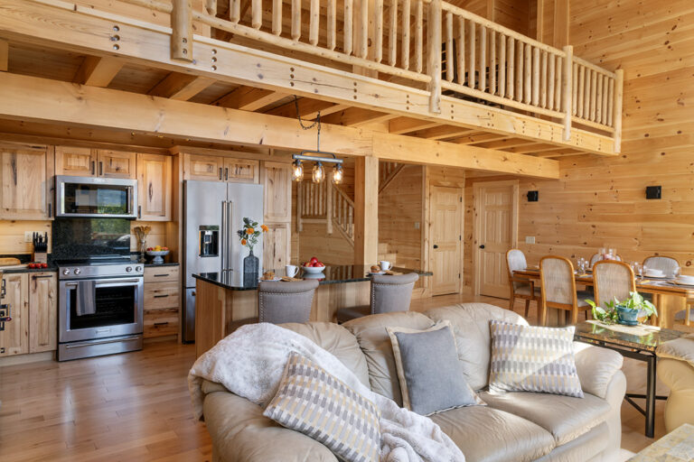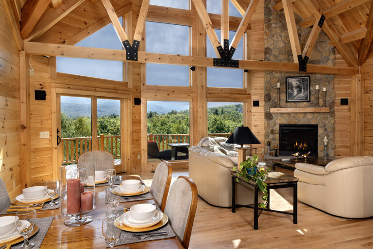 A spacious custom Kearsarge log home featuring a cathedral ceiling, an open-concept living area with fireplace, a main-floor master suite, expansive covered porch and deck, and lofted bedrooms —blending rustic craftsmanship with modern comfort and panoramic natural light.