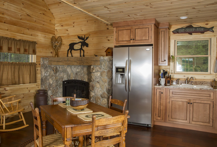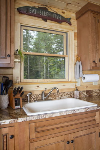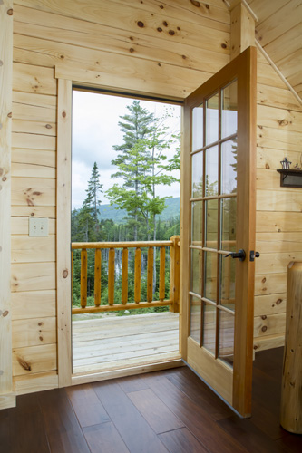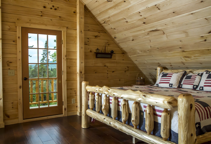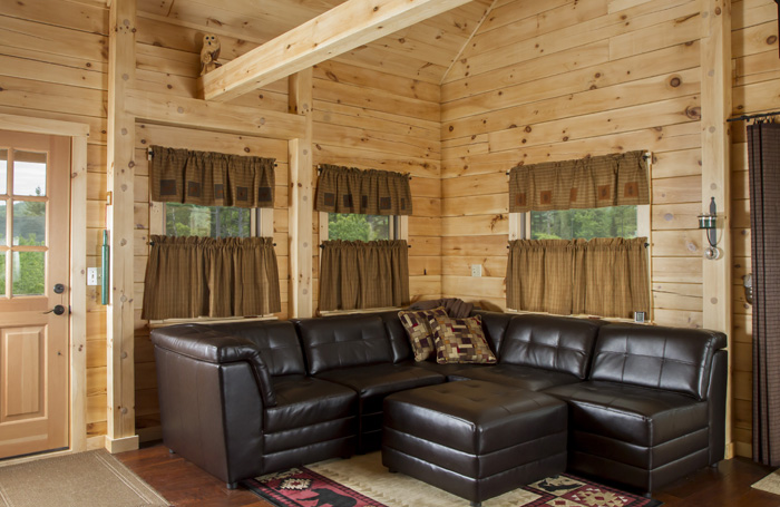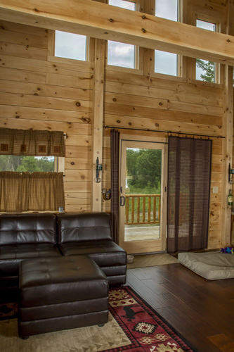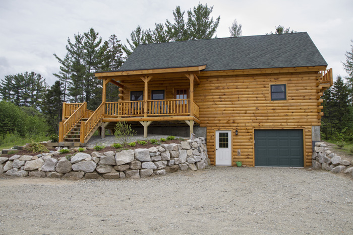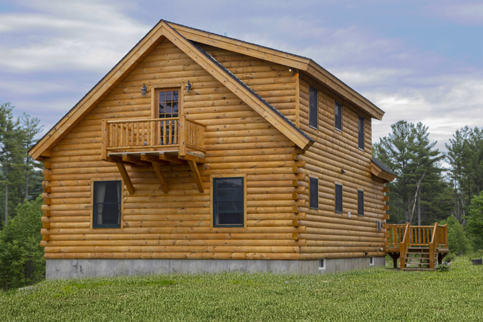 This Pine Ridge log home model features a classic rustic design with a welcoming covered porch, full log gables, and a thoughtfully laid-out two-story floor plan.